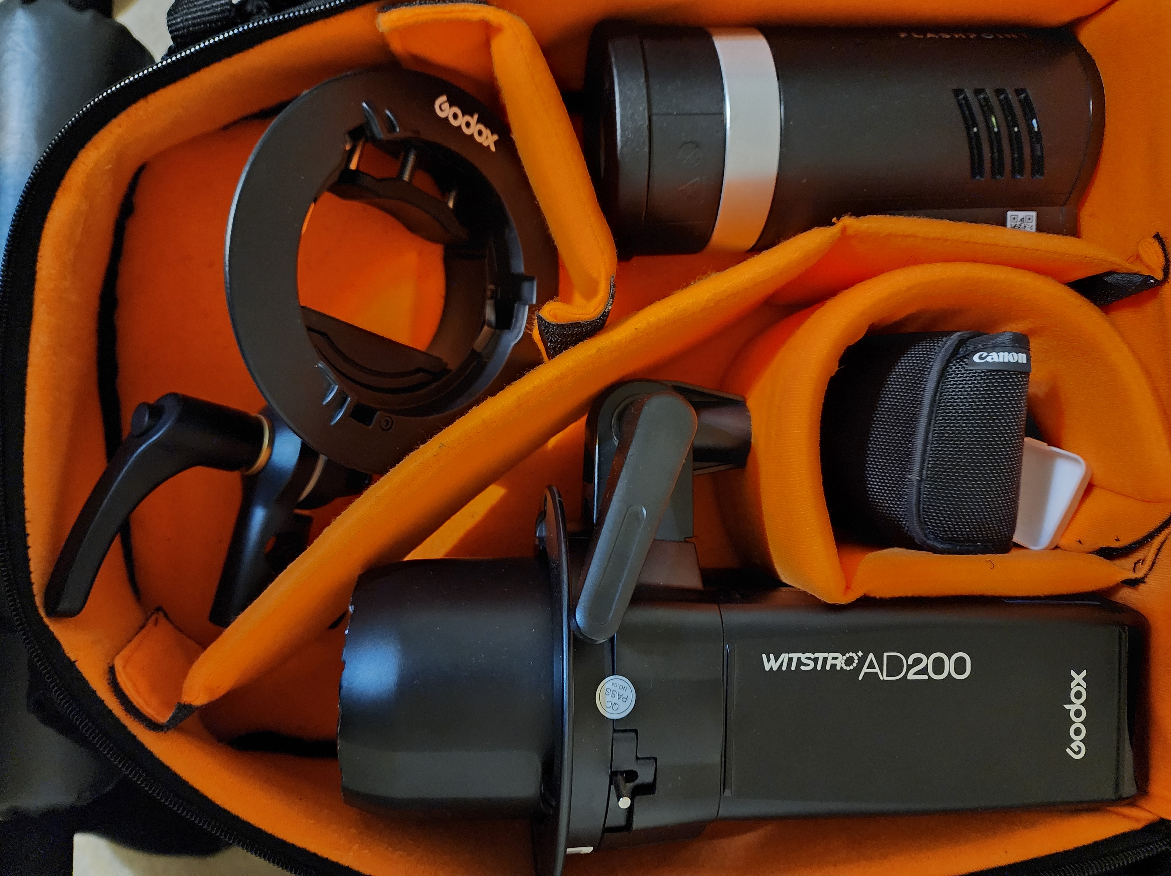 I used to carry two off camera lighting bags. One bag was dedicated to the two AD200 carrying cases, mainly to hold the bare bulb adapters and bare bulbs. The second bag held the AD300 and Bowens S mount holders and adapters. Even if I could find a smaller carrying bag solution for the necessary bits this would still require assembly on site. Now I can get what I need in one bag and they are ready to go. No more assembly and disassembly and trying to keep track of all the bits and pieces.