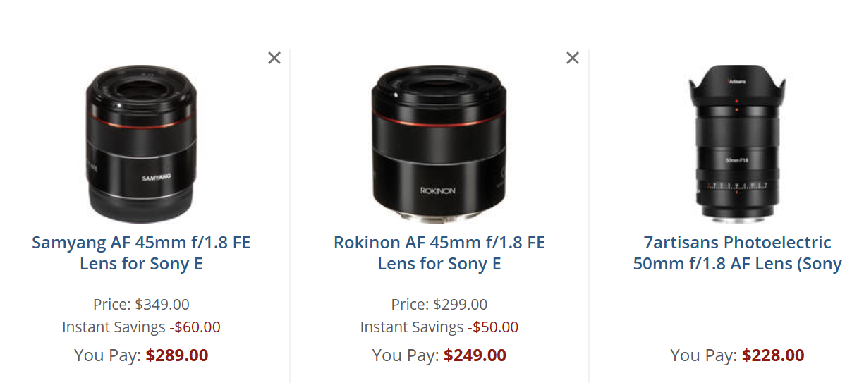 For comparison’s sake let us look at a full frame normal Sony mount AF lens that came the closest to what I was looking for, the Rokinon/Samyang 45mm f/1.8.