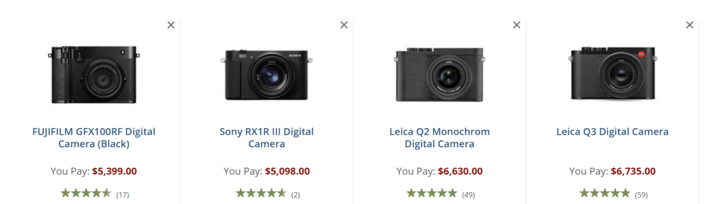 Film – GA645, fan favorite-X100VI, function-GFX100S, and fashion-GFX100RF.